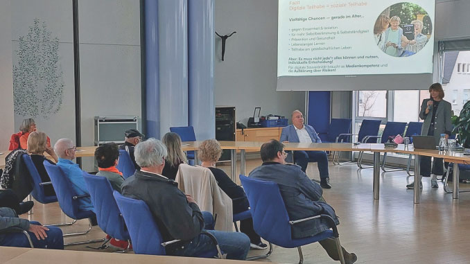 In ihrem Vortrag „Digital mobil im Alter“ stellt Laura Hänsch von der Stiftung Digitale Chancen Berlin zunächst innovative Angebote zum Erleben und Erfahrungen sammeln digitaler Medien durch die Stiftung vor. Danach referiert sie über Mobilität und Alltagsorganisation, Gesundheitsversorgung, Informationszugang und kognitive Fitness, soziale, gesellschaftliche sowie kulturelle Teilhabe und Sicherheit durch Hausnotrufsysteme, smarte Uhren und Sturz- sowie Herdsensoren. Diese „Digitalangebote“ verbessern die Selbständigkeit und Lebensqualität im Alter und verhindern Einsamkeit und Isolation. Es muss nicht jede*r alles können und nutzen – es bleibt die individuelle Entscheidung! Für digitale Souveränität braucht es Medienkompetenz und die Aufklärung über Risiken! Diese Herausforderungen nehmen nach einer Studie bei den über 60-Jährigen 87 % und den über 80-Jährigen 62 % an und sind online meist mittels Smartphone unterwegs. Die Stiftung hat unter www.digital-mobil-im-alter.de/wissen/glossar ein „Digital Glossar“ erstellt, das Begriffe einfach erklärt und nützliche Praxistipps bzw. Links zu weiterführenden Informationen bietet. Norbert Greim erläuterte nun den zahlreichen Zuhörenden die 9 Workshops mit den Informationen zu unterschiedlichen Themen.