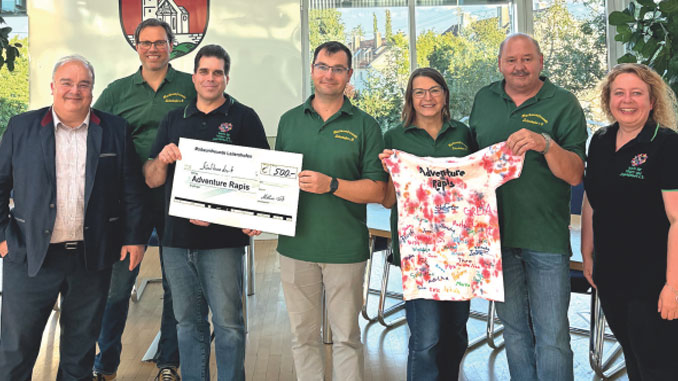 Im Bild von links: Erster Bürgermeister Paulus Metz, Kassierer Maibaumfreunde Leitershofen Günther Wagner, Adventure Rapis Michael Moritz, 1. Vorstand Maibaumfreunde Leitershofen Matthias Fritz, Schriftführerin Maibaumfreunde Leitershofen Helga Fritz, 2. Vorstand Maibaumfreunde Leitershofen Robert Gastner, Frau Moritz Adventure Rapis