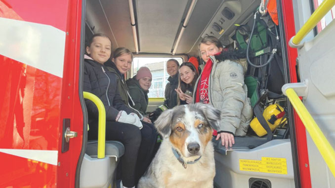 Schülerinnen der Ganztagesklasse 5a mit Schulhund Lasse bei der Freiwilligen Feuerwehr Stadtbergen: Alle einsatztauglich!
