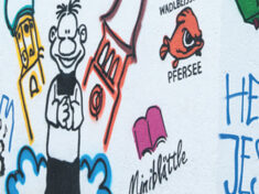 Ein Graffiti der anderen Art – ansehnlich und mit Aussage – grüßt an der Ecke Franz-Kobinger- und Färberstraße. Foto: Gunnar Olms